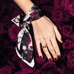 Ce carré de soie est illustré d'une multitude de fleurs roses et d'encre sombre et pourpre.