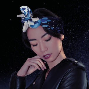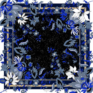 Les Mille et Une Nuits nous transportent dans un univers où s'entremêlent la magie, l’amour et l’aventure. La résilience est aussi au cœur de ce récit ancestral. Ici la nuit étoilée est entourée de fleurs capiteuses, et d'ornements floraux bleutés.